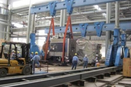 2. 左右配置有高功率升降机,高功率升降机之间挂上的梁柱,构成门型式装置。